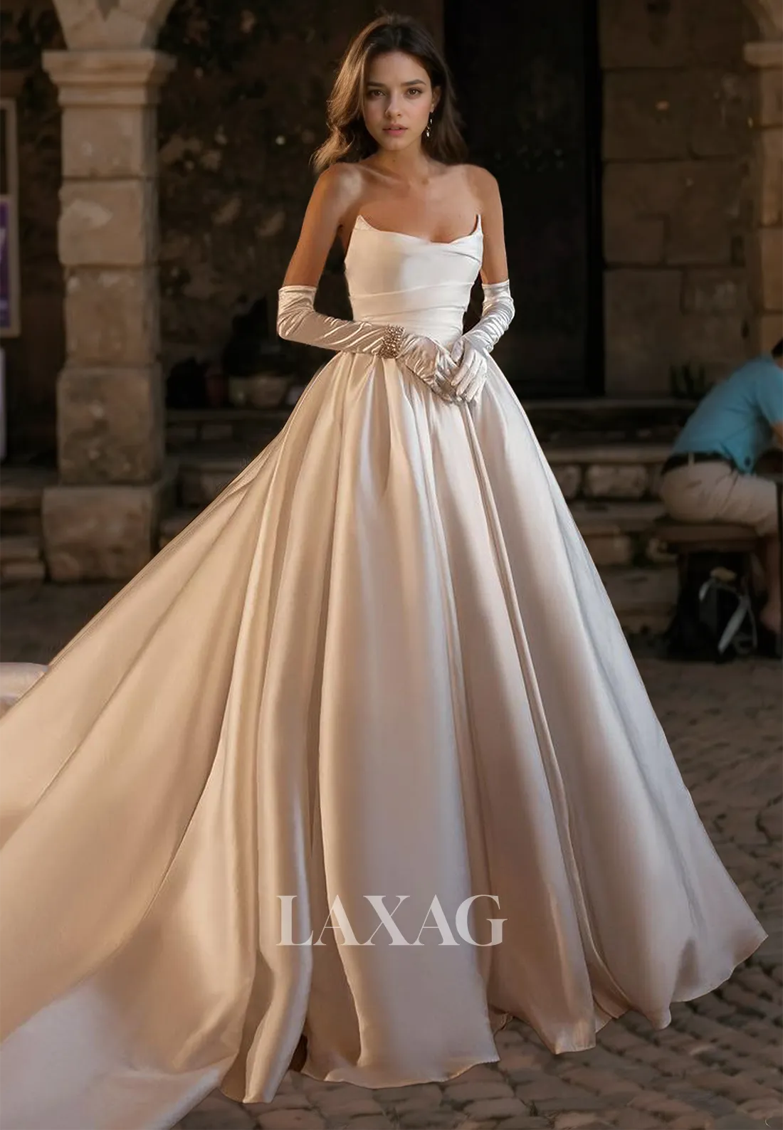 Elevate your wedding dress game with our Ornate Tube Top Off-Shoulder Bride Gowns. Featuring a beautiful pleated train and A-Line silhouette, this dress will turn heads on your special day. Complete the look with included gloves and feel like a true bride.